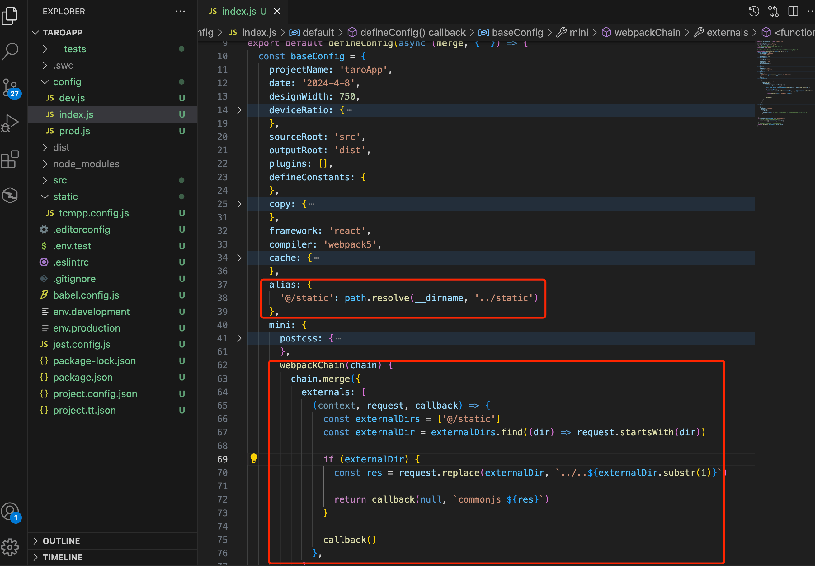 - Configure taro packaging, set alias for the static directory, and set externals related configuration: