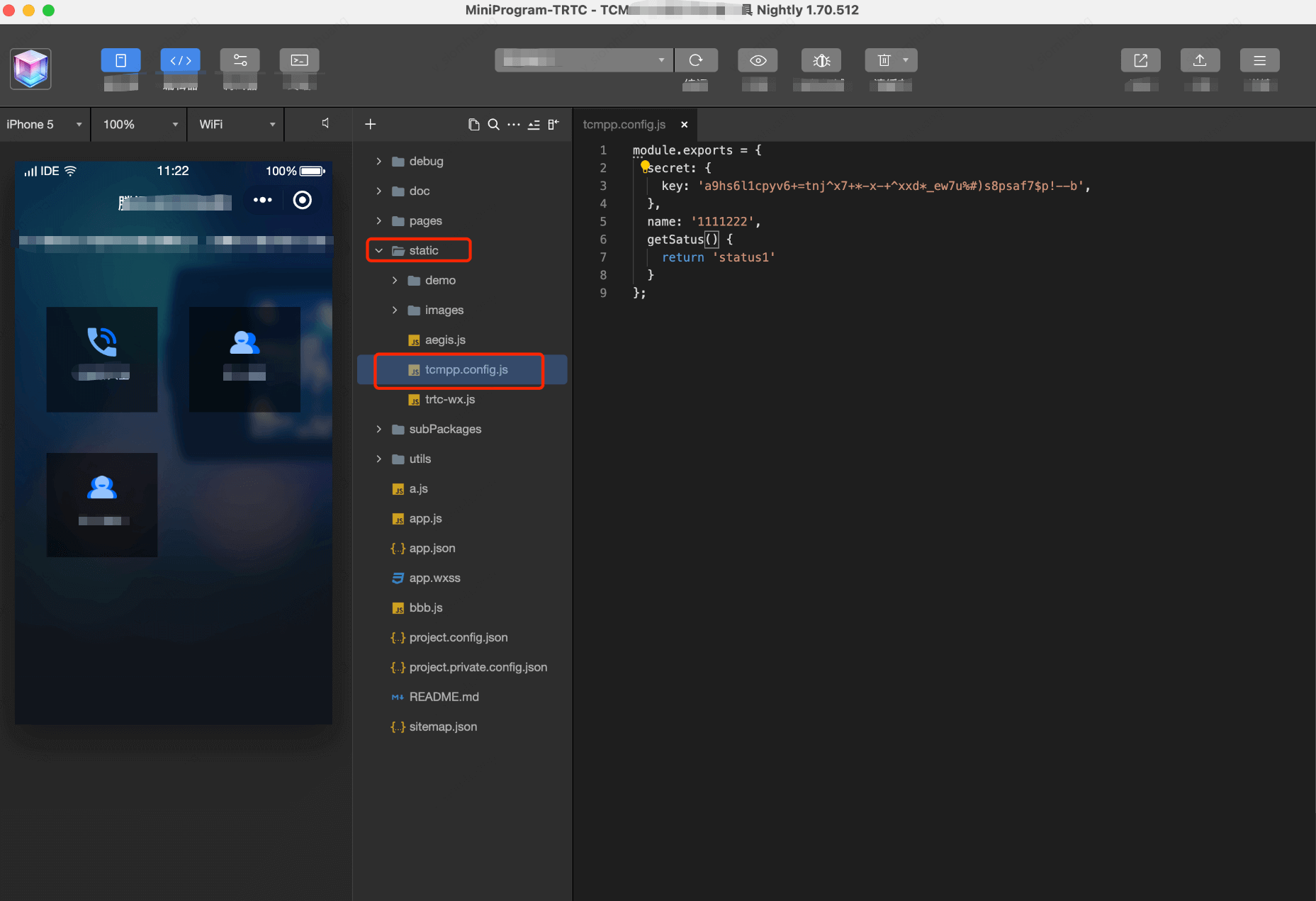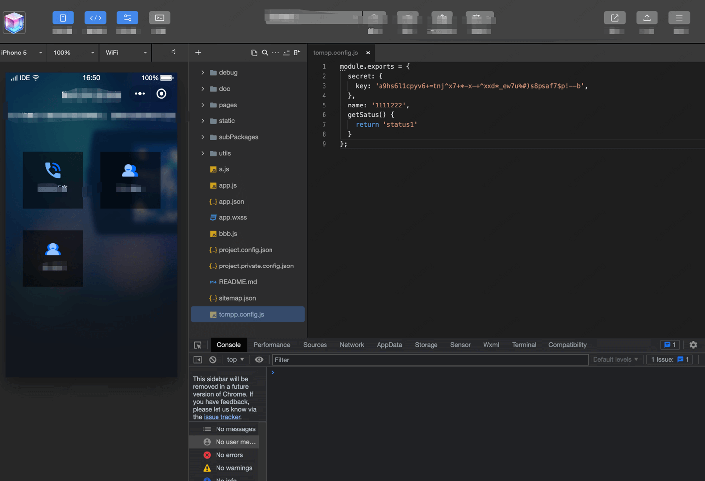 1.Create a tcmpp.config.js file in the directory at the same level as app.json in the mini program project. You can write some sensitive data information or core algorithms and other methods into this js for export and use. During the compilation stage, tcmpp.config.js will be obfuscated and encrypted: