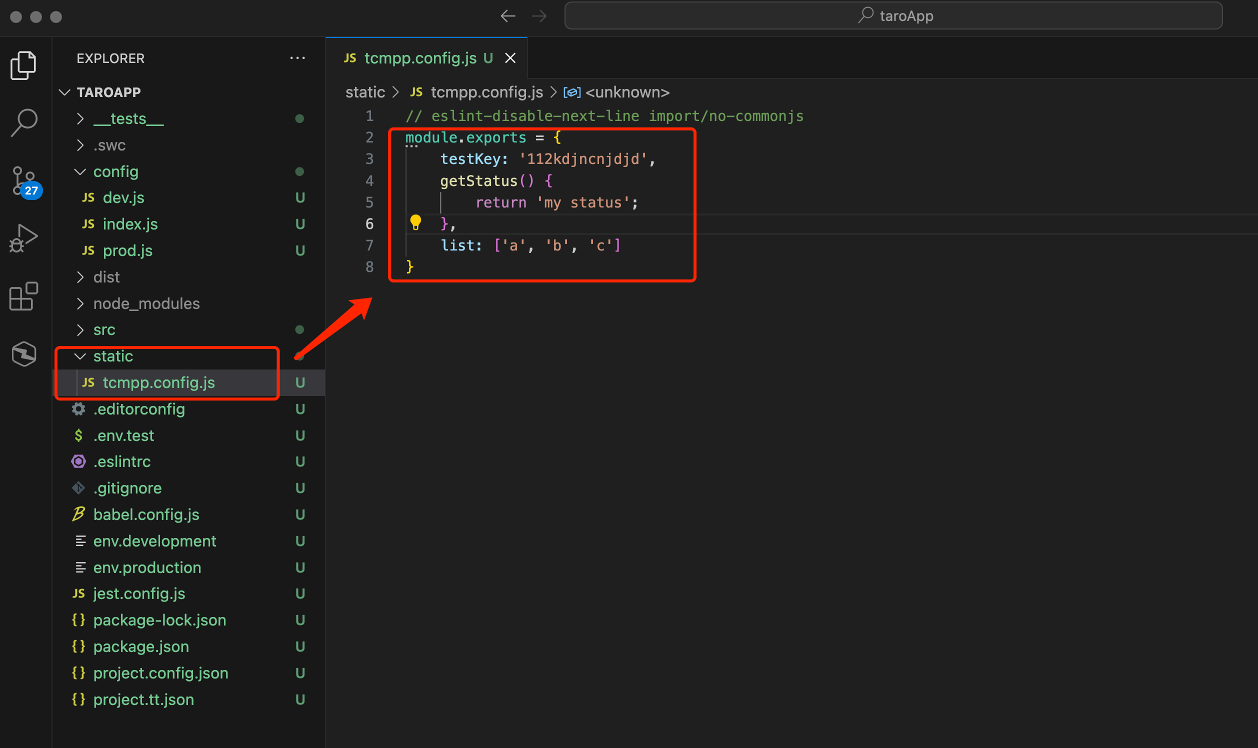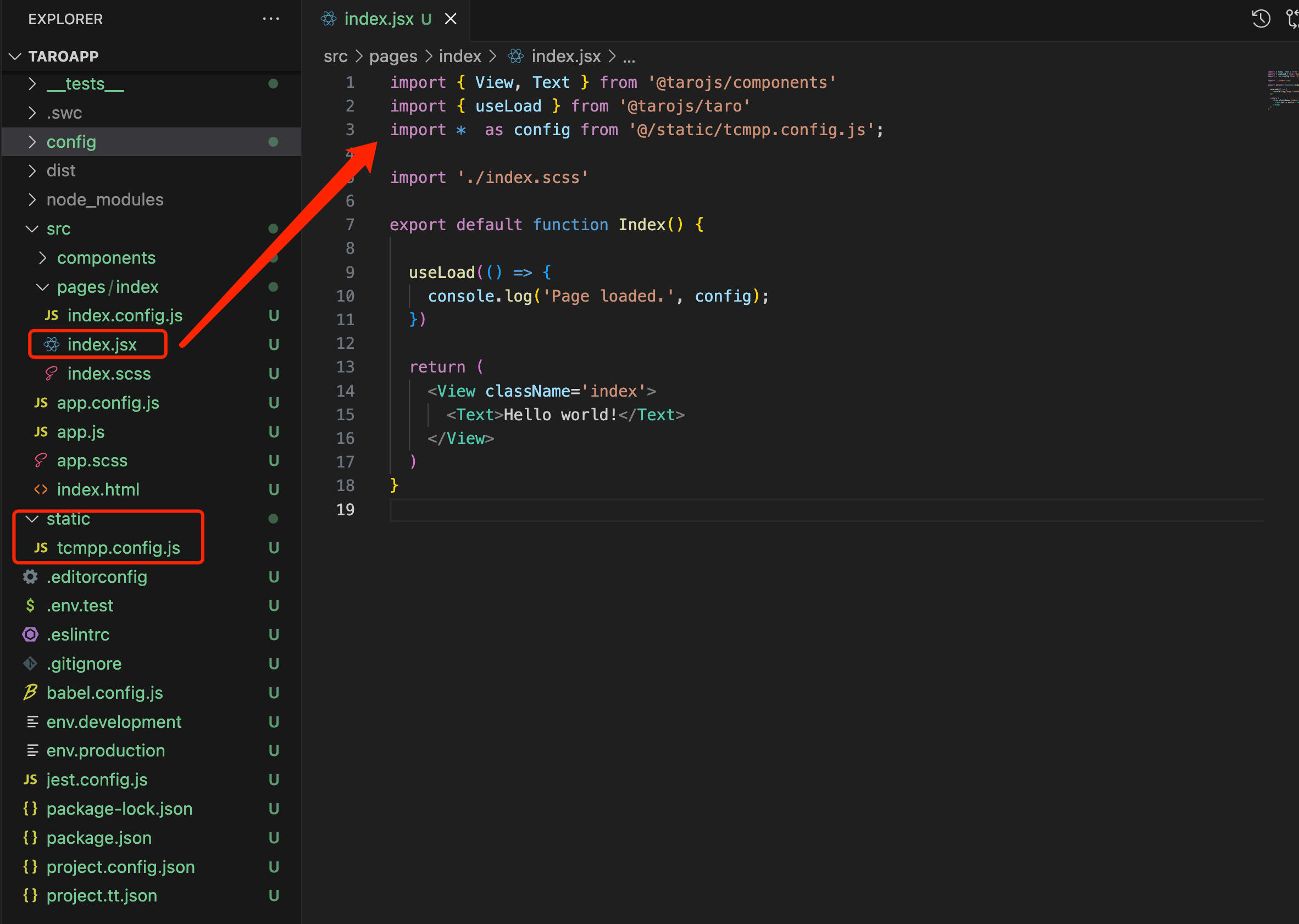 3.Put Tcmpp.config.js in the static directory at the same level as pages, and use the content exported by Tcmpp.config.js in the project pages/index/index.jsx: