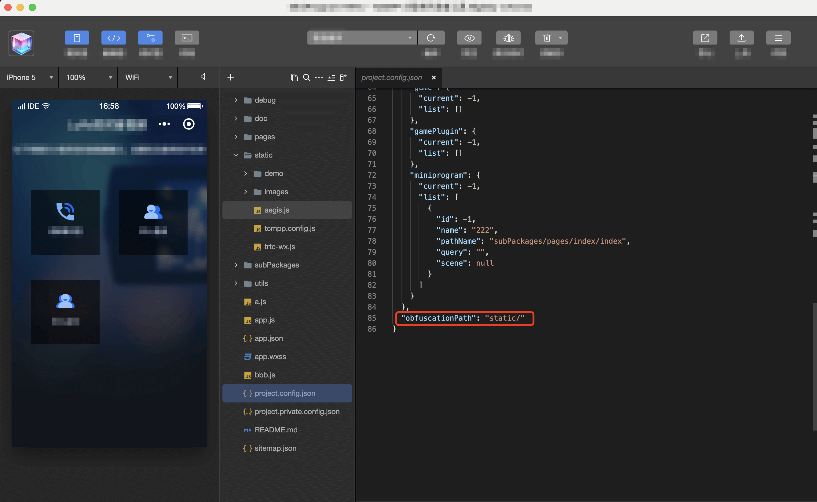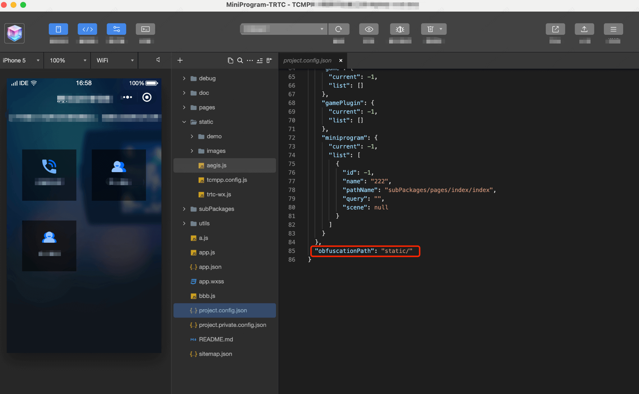 2.In project.config.json, configure the obfuscationPath field to the static directory path where Tcmpp.config.js is located so that the IDE can find this file for obfuscation encryption.