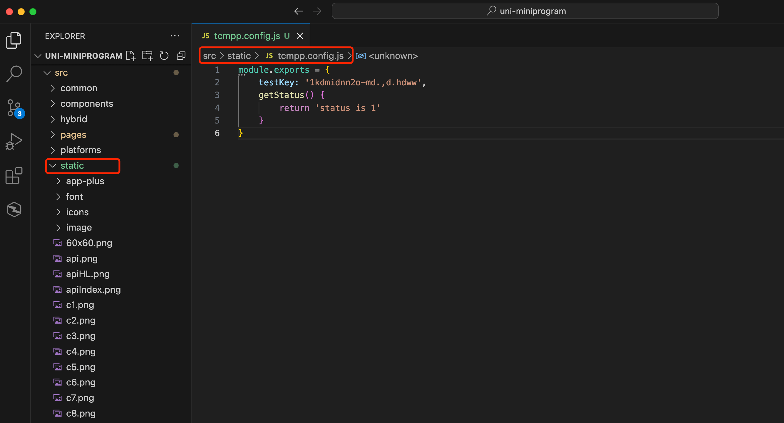 2.If you need to modify the directory where the tcmpp.config.js file is located, such as putting this file in a directory like static, you can configure the directory path where tcmpp.config.js is located in the obfuscationPath field in project.config.json. If the obfuscationPath field is not configured or configured as an empty string, the default search will be tcmpp.config.js in the directory at the same level as app.json.